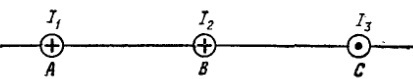 28. На рисунке изображены сечения двух прямолинейных бесконечно длинных проводников с токами. Расстояния АВ = ВС = 5 см, токи I1 = I2 = I и I3 = 2I. Найти точку на прямой АС, в которой напряженность магнитного поля, вызванного токами I1, I2 и I3, равна нулю.